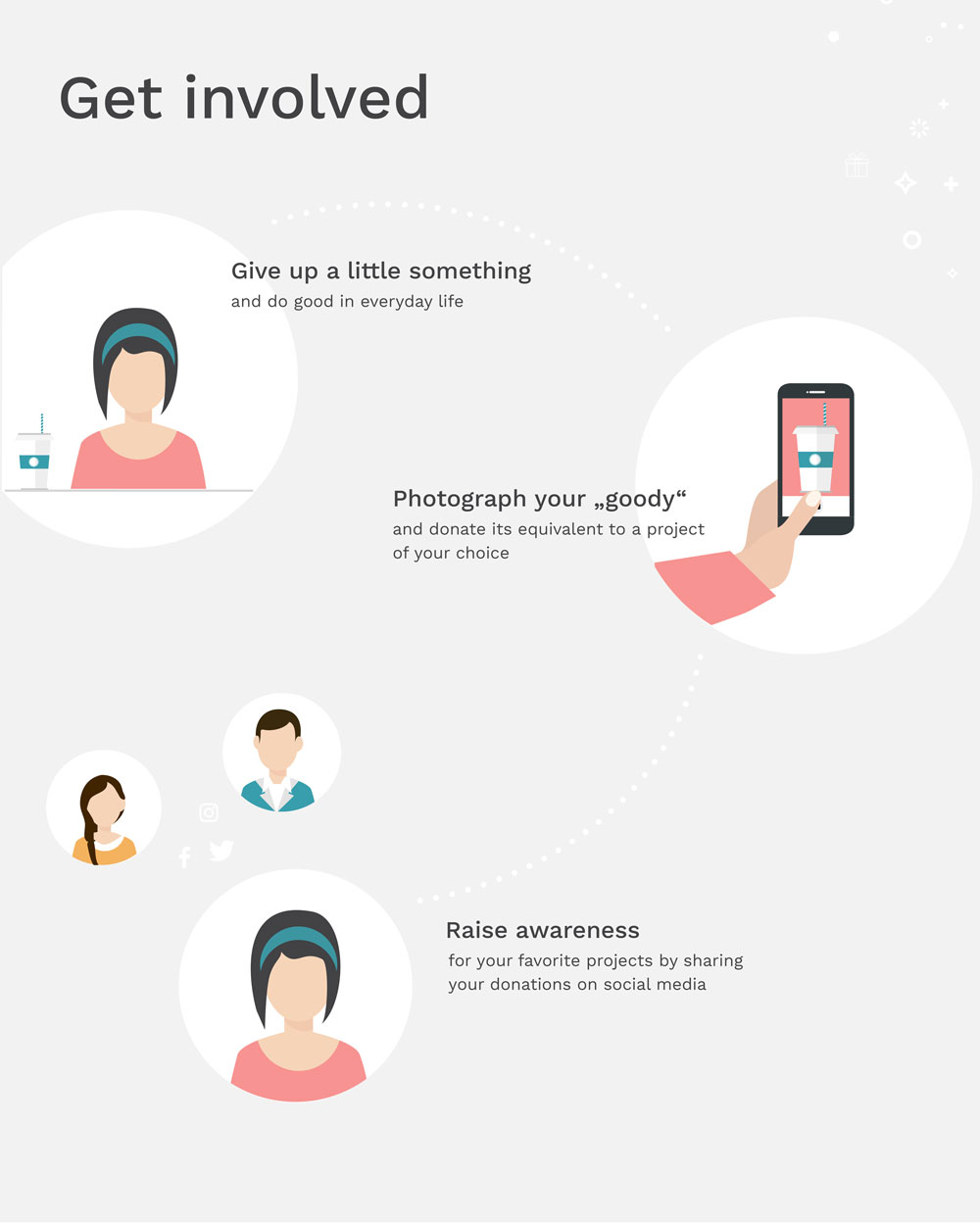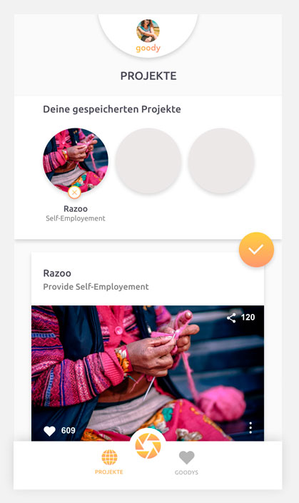 Die App goody möchte das Spenden im Alltag so einfach wie nur möglich gestalten. Es geht hier nicht um große Summen, sondern um kleine Beträge die quasi im „Vorbeigehen“ eine Wirkung erzielen sollen. Nachdem man das passende Projekt ausgewählt hat, ist der eigentliche Spendenvorgang in drei Schritten abgewickelt.